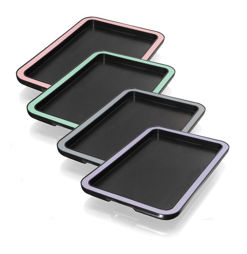 Amplia bandeja plástica. Fabricada en plástico reciclado negro y detalle de color con compuesto de madera. ¡Ahorro de hasta un 22% de emisión de CO2!