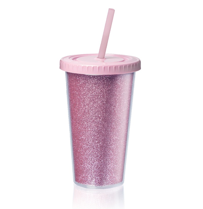 Vaso térmico con sorbete, ideal para bebidas frías. Libre de BPA. Cuerpo cristal con insert con brillante. Capacidad 500 cc. Lavar a mano, no usar en microondas.