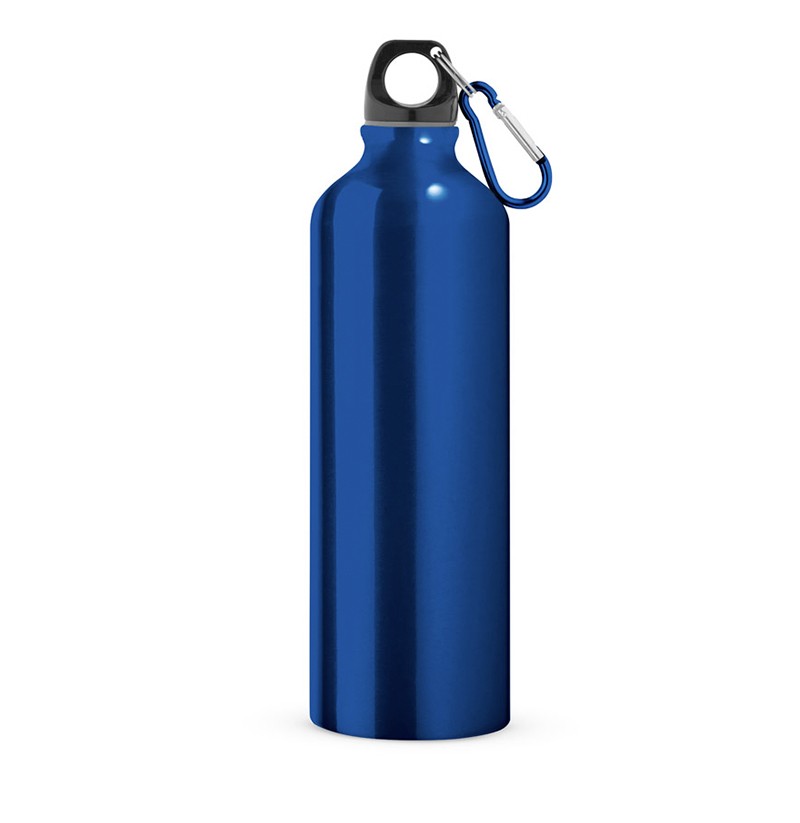 Botella deportiva de aluminio con mosquetón. Acabado brillante. Capacidad hasta 750 ml. Tamaño: ø73 x 247 mm.