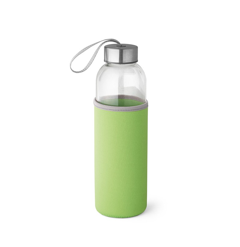 Botella de vidrio con tapa de acero inoxidable. Incluye una cinta para su transporte en la tapa y funda de softshell. Capacidad de hasta 520 mL. Tamaño: ø65 x 225 mm